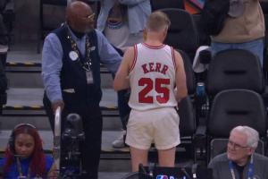 这老古董哪儿找来的啊?有球迷身穿科尔公牛球衣场边观赛