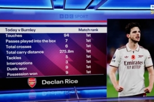 简直是战神!赖斯对阵伯恩利触球、抢断、拦截等8项数据全场居首