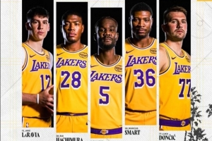 湖人:东契奇、斯玛特、拉拉维亚、八村、艾顿。
