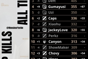 全球总决赛总击杀数榜单:Ruler来到第二位,Gumayusi第四