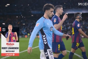 上演帽子戏法!西甲官方:莱万当选塞尔塔vs巴萨的全场最佳