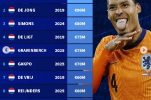 以下为荷兰球员历史身价榜top10: