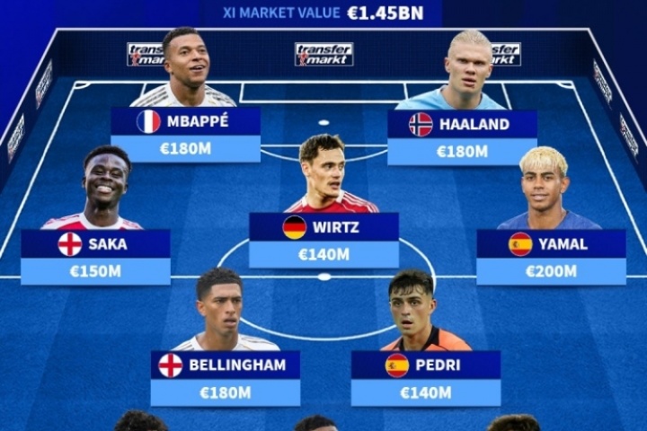 前锋:亚马尔(2亿欧)、姆巴佩(1.8亿欧)、哈兰德(1.8亿欧)、萨卡(1.5亿欧)