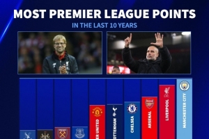 英超近10年总积分排名:曼城847分居首,利物浦、阿森纳二三位